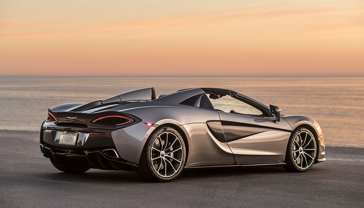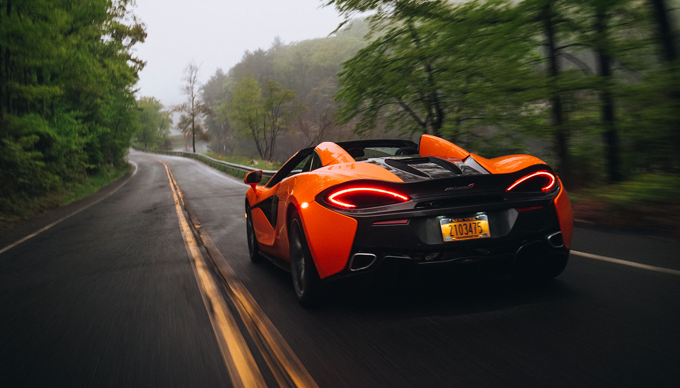 The front of the 570S Spider is strikingly low, creating a poised stance that emphasizes the mid-engined layout. The crisp contours of the bonnet pierce the air and channel it over fluid, sculpted surfaces towards the side intakes and rear of the car. The forged alloy wheels shown here have been specially designed for the Spider. Lightweight and extra strong, they’re supplied with high-grip Pirelli P Zero™ Corsa tyres to deliver even faster cornering, improved traction and better braking. Perhaps the first and last design element other drivers will notice is the McLaren speedmark. Both the high-intensity LED headlights and the slimline LED tail lights are fashioned in the shape of this distinctive McLaren symbol. Despite the advanced mechanism that makes the roof completely disappear into the car, 52 litres of luggage space is available at the rear when the roof is up. Another 150 litres is at the front, making the Spider an ideal choice for that long weekend away.