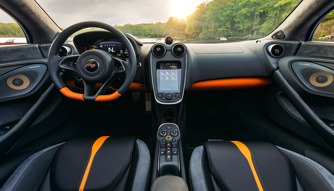 An unintended benefit of the 570S Spider is that more people can appreciate the elegant interior when the roof is down. It features the finest hand-stitched leather, satin-chrome highlights and a ‘floating’ centre console. The result is an environment where you feel fully engaged to exploit the Spider’s inspiring performance, while being equally at ease to enjoy the exceptional comfort on longer journeys. As eye-catching as it is, the interior follows McLaren’s design philosophy of ‘Everything for a reason’. Controls are positioned for maximum ease of use and minimum distraction. This exquisite and uncluttered interior is designed for pure driving engagement. The Bowers & Wilkins 12-speaker surround system offers enhanced sound beyond the standard 4-speaker 240W audio system. Driven by a 14-channel 1280W amplifier it delivers crystal clear music through two carbon fibre Rohacell sub-bass woofers, five Kevlar mid-range drive units, and five aluminium Nautilus tweeters.