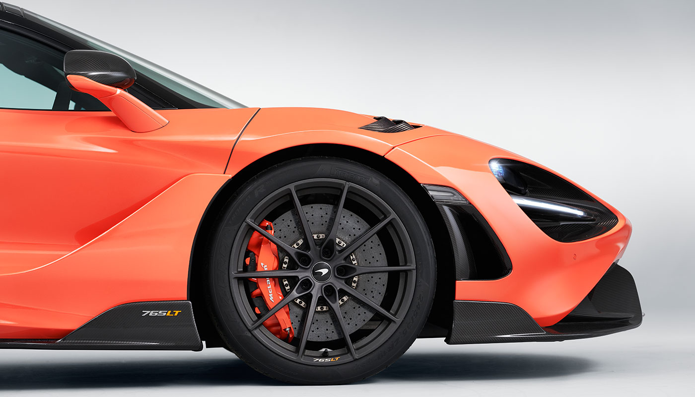 Handling that rewrites the rules. Electrifies. Total connection between car and driver. Everything important is enhanced by lightness. So extreme measures are used to cut weight. Every Longtail is defined by this uncompromising attitude. Which is why the 765LT weighs just 1,339kg. 80kg less than the lightweight McLaren 720S. The new, unique carbon fibre bodywork elements are incredibly light. The dramatic new all-titanium quad-exit exhaust system weighs just 10.9kg – 40% lighter than if it were made of steel. The whole interior is pared back to the LT essentials. And huge savings are achieved with the new ultra-light 10-spoke alloy wheels. Because they cut unsprung weight – which has so much influence on performance, handling and ride. Even glazing doesn’t escape the obsessive search for lightness. Thinner glass is used. And motorsport derived polycarbonate. The 765LT was always going to be outrageously light. Like every Longtail before it. And the car that it’s based on – the 720S – is already a model of lightness and agility. The weight of each wheel is unsprung weight. It’s not supported by the suspension. Saving it creates a big advantage, because every kilogram cut here is worth the same as 4kg in sprung bodyweight.